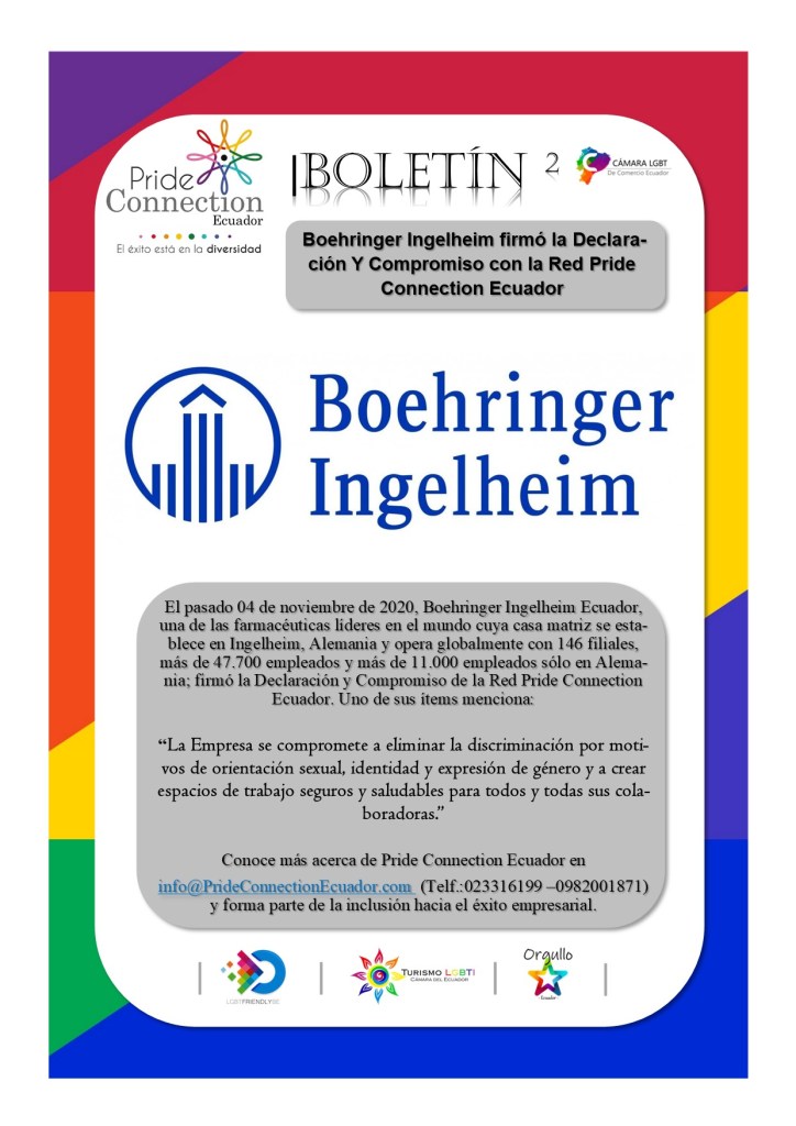 El pasado 04 de noviembre de 2020, Boehringer Ingelheim Ecuador, una de las farmacéuticas líderes en el mundo cuya casa matriz se establece en Ingelheim, Alemania y opera globalmente con 146 filiales, más de 47.700 empleados y más de 11.000 empleados sólo en Alemania; firmó la Declaración y Compromiso de la Red Pride Connection Ecuador. Uno de sus ítems menciona:
