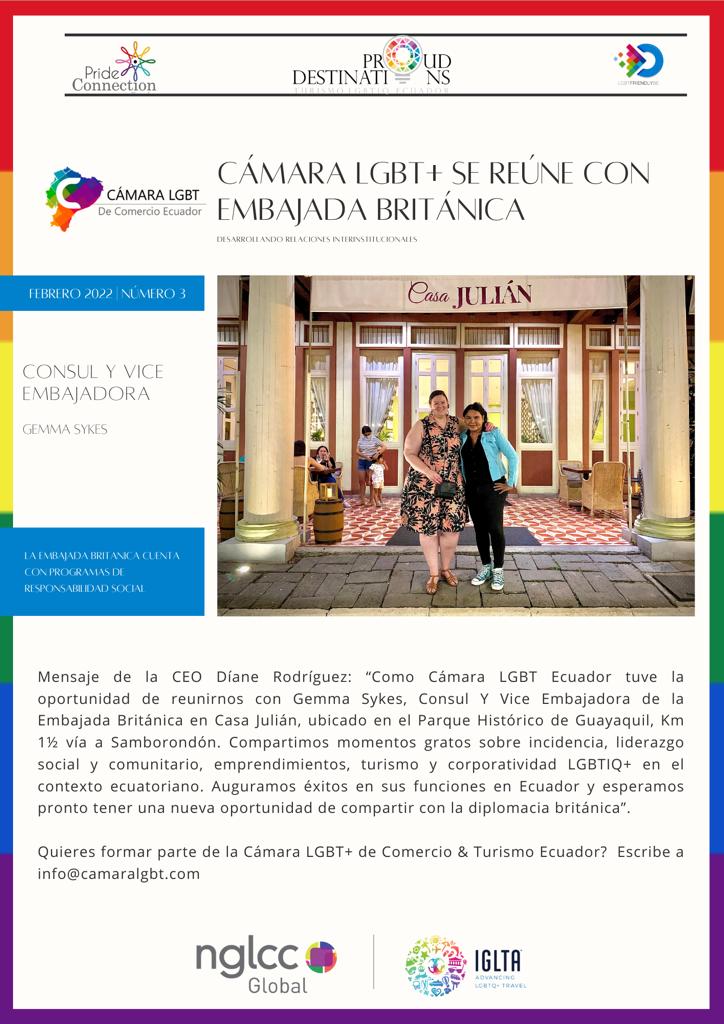 Mensaje de la CEO Diane Rodríguez: “Como Cámara LGBT Ecuador tuve la oportunidad de reunirnos con Gemma Sykes, Cónsul Y Vice Embajadora de la Embajada Británica en Casa Julián, ubicado en el Parque Histórico de Guayaquil, Km 1½ vía a Samborondón. Compartimos momentos gratos sobre incidencia, liderazgo social y comunitario, emprendimientos, turismo y corporatividad LGBTIQ+ en el contexto ecuatoriano. Auguramos éxitos en sus funciones en Ecuador y esperamos pronto tener una nueva oportunidad de compartir con la diplomacia británica”.