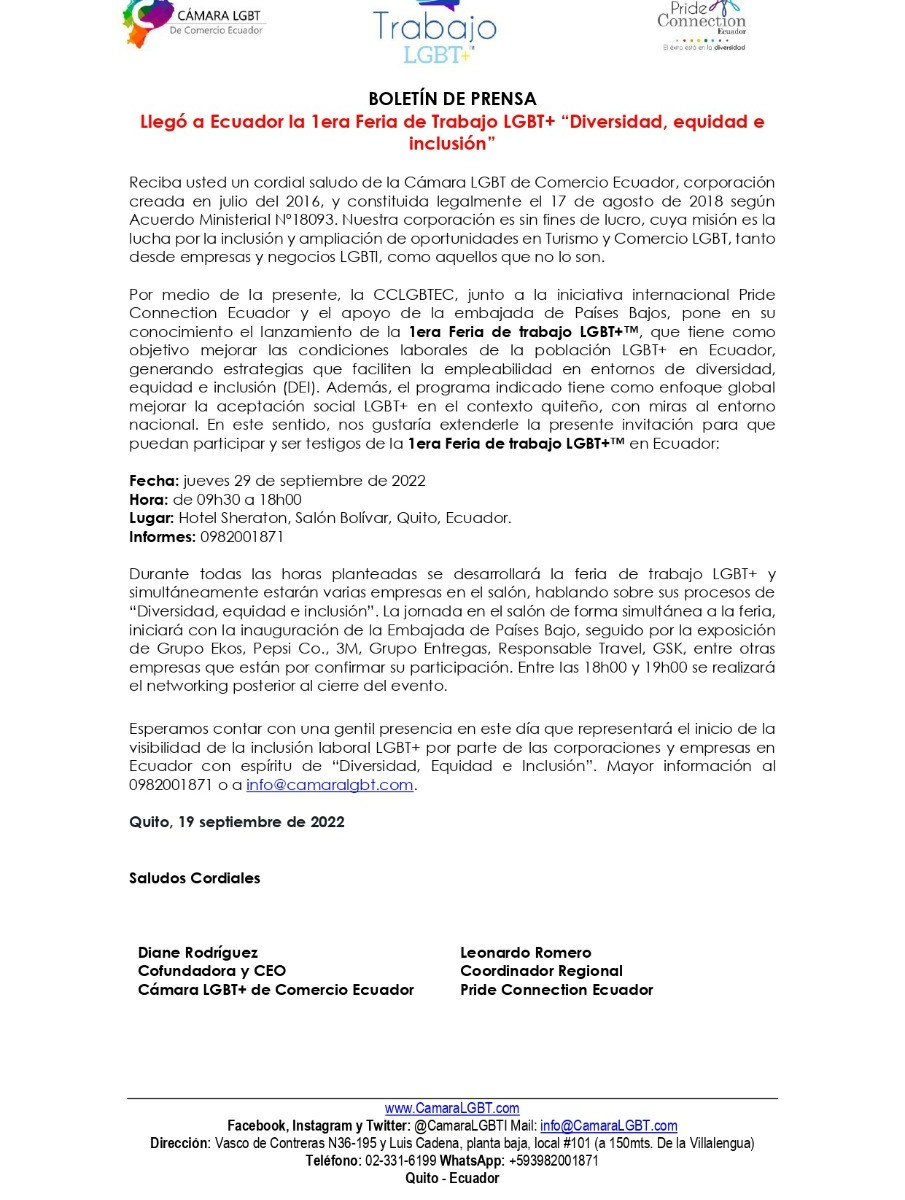 Por medio de la presente, la CCLGBTEC, junto a la iniciativa internacional Pride Connection Ecuador y el apoyo de la embajada de Países Bajos, pone en su conocimiento el lanzamiento de la 1era Feria de trabajo LGBT+™️, que tiene como objetivo mejorar las condiciones laborales de la población LGBT+ en Ecuador, generando estrategias que faciliten la empleabilidad en entornos de diversidad, equidad e inclusión (DEI). Además, el programa indicado tiene como enfoque global mejorar la aceptación social LGBT+ en el contexto quiteño, con miras al entorno nacional. En este sentido, nos gustaría extenderle la presente invitación para que puedan participar y ser testigos de la 1era Feria de trabajo LGBT+™️ en Ecuador: