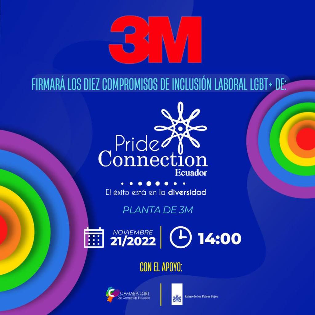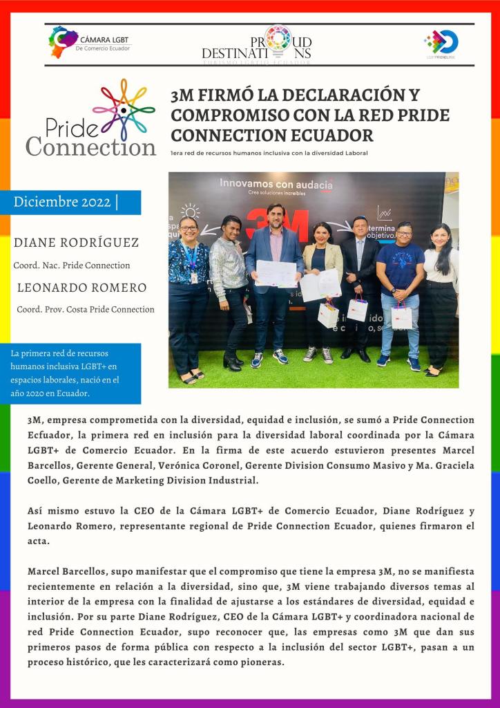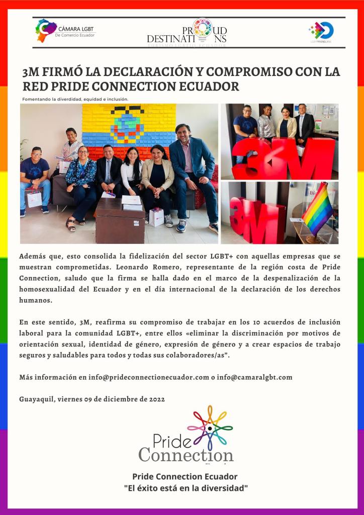 3M, empresa comprometida con la diversidad, equidad e inclusión, se sumó a Pride Connection Ecuador, la primera red en inclusión para la diversidad laboral coordinada por la Cámara LGBT+ de Comercio Ecuador. En la firma de este acuerdo estuvieron presentes Marcel Barcellos, Gerente General, Verónica Coronel, Gerente Division Consumo Masivo y Ma. Graciela Coello, Gerente de Marketing Division Industrial.