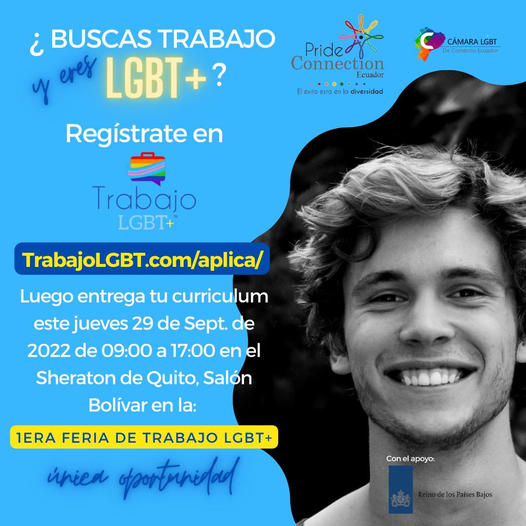 ¿Buscas TRABAJO y eres LGBT+? Regístrate en TrabajoLGBT.com/aplica/ Luego entrega tu curriculum este jueves 29 de Sept. de 2022 de 09:00 a 17:00 en el Sheraton de Quito, Salón Bolívar en la: 1era FERIA DE TRABAJO LGBT+ Única oportunidad!