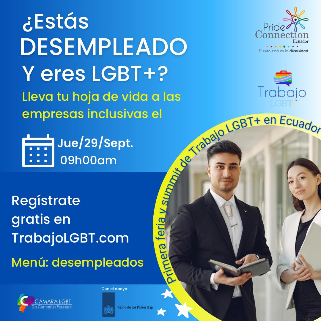Lleva tu hoja de vida a las empresas inclusivas que estarán el Jue/29/Sept. 09h00am Regístrate gratis en desempleados LGBT+ https://trabajolgbt.com/desempleados/ Si eres una empresa que busca participar regístrate en este link https://trabajolgbt.com/empresas/ Organizan: Pride Connection Ecuador “El éxito está en la diversidad” Cámara LGBT+ Ecuador Primera corporación trabajando en comercio, inversiones y turismo LGBT+