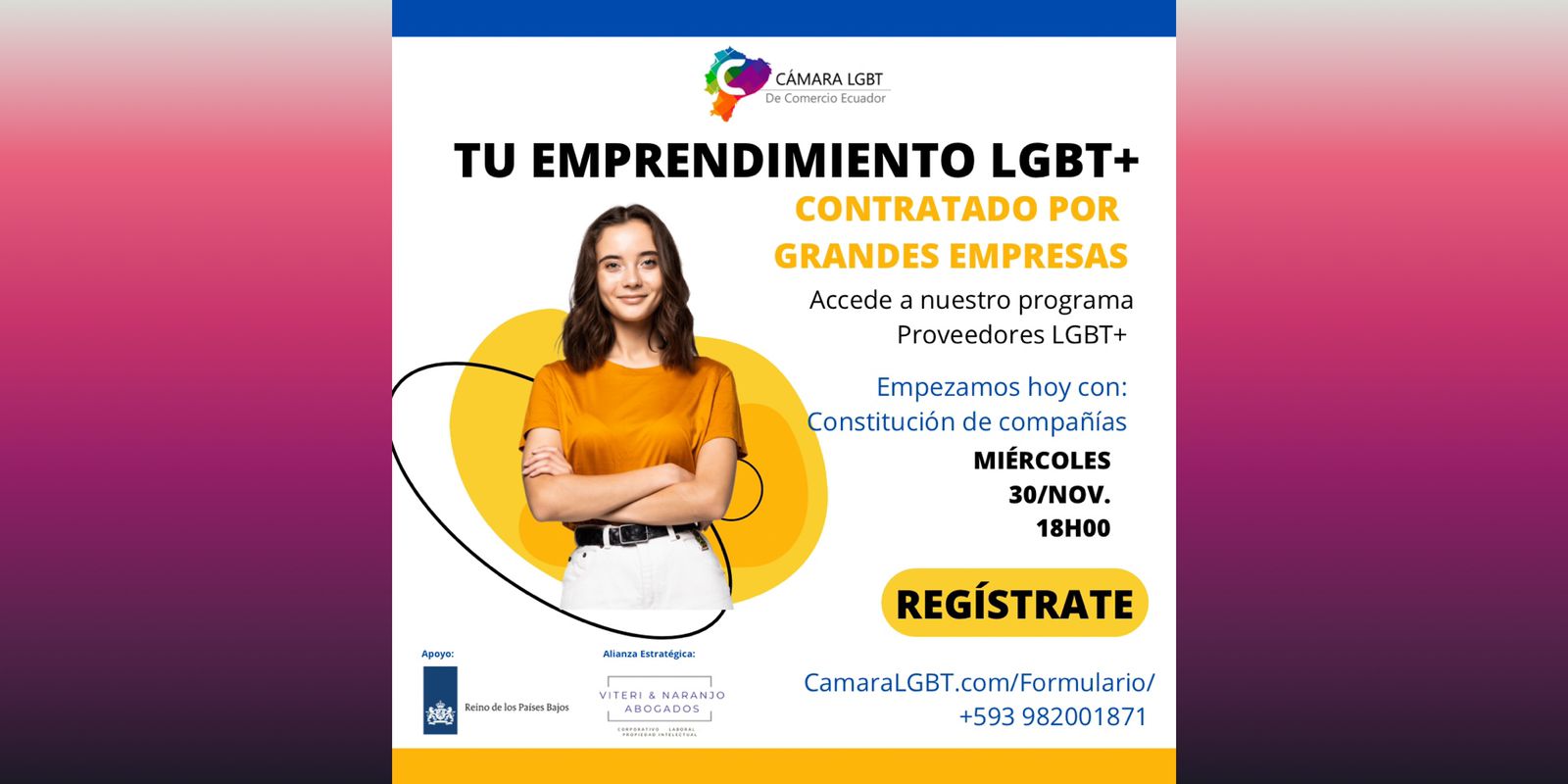 Fuente: Accede a nuestro programa Proveedores LGBT+. Empezamos hoy con: Constitución de compañías Miércoles 30/Nov. 18H00 REGíSTRATE 👉🏼 http://www.CamaraLGBT.com/Formulario/ Info adicional +593982001871